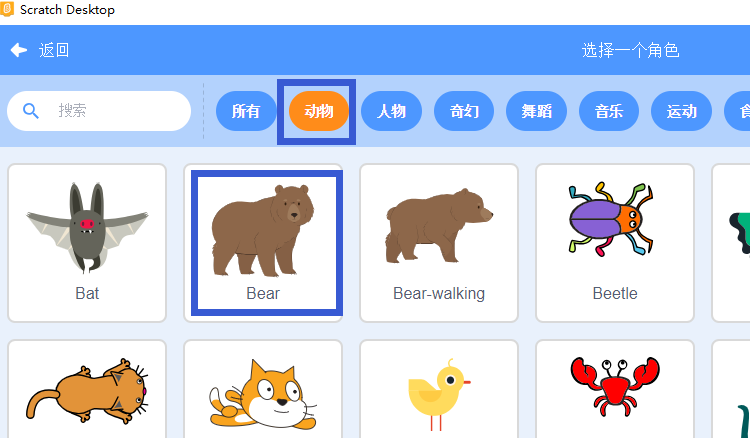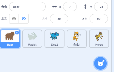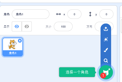 打开Scratch软件,默认会有一个猫咪角色,我们保留,然后我们从角色库中添加其它的角色