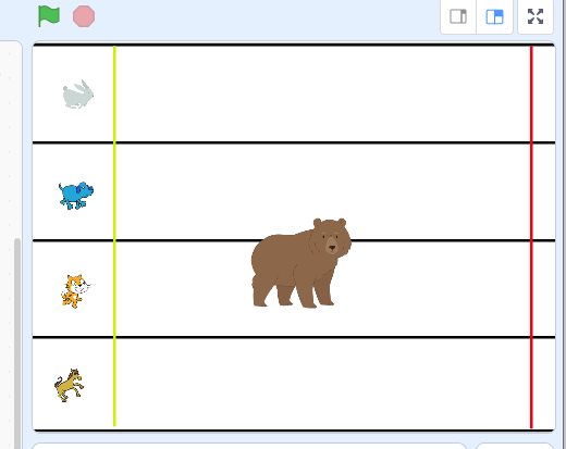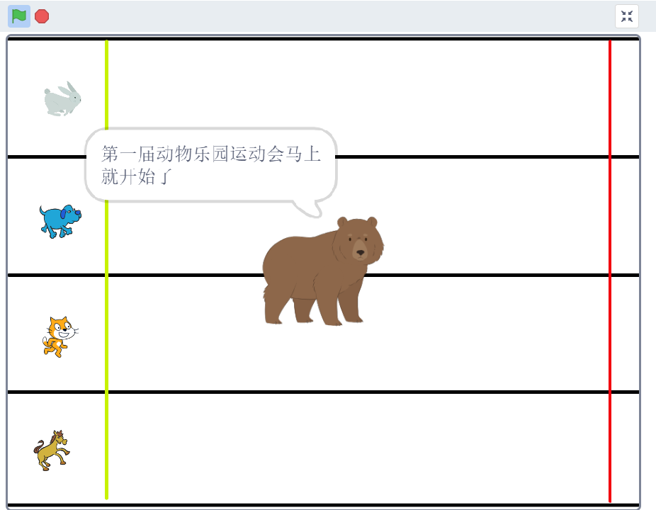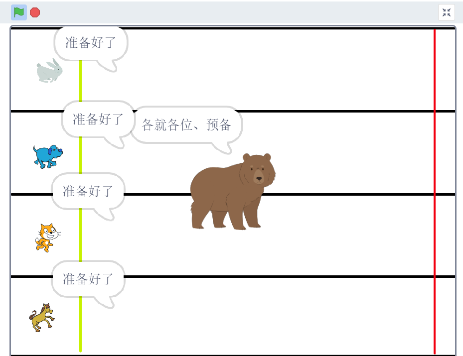 熊老师在程序启动后宣布比赛开始,让运动员准备就绪,然后吹口哨开始比赛;其他的参赛小伙伴要一边进行跑步比赛的名次角逐,同时还要模拟真实的跑步姿势所以,其他的参赛小伙伴都应该会有两个并列的程序,一个实现跑步比赛,一个实现跑步姿势切换。