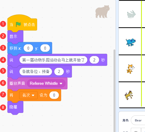 - 熊老师:开始→显示→初始位置→说运动会开始→询问是否准备就绪→吹口哨→变量初始化→隐藏