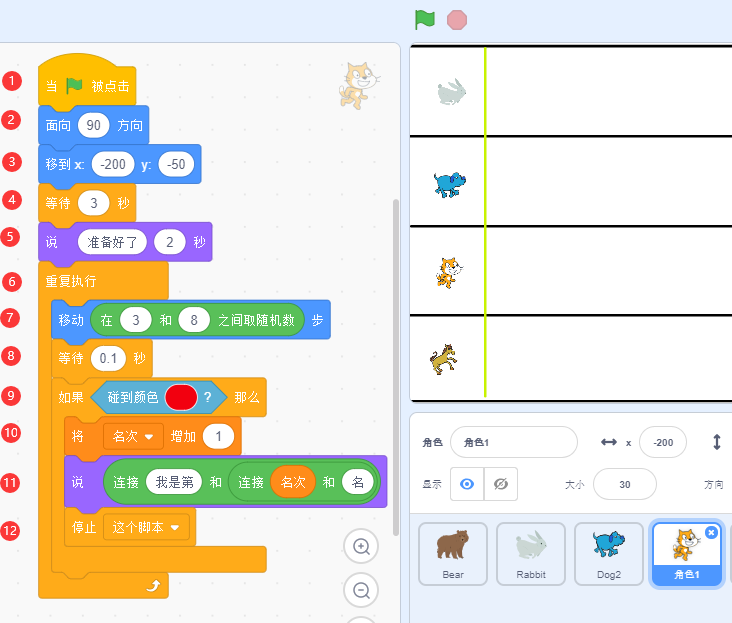- 猫咪1:开始→朝向→初始位置→等待→准备好了→跑步【移动步数→时间间隔→是否碰到终点线(名次+1→说出名次→停止当前脚本)】