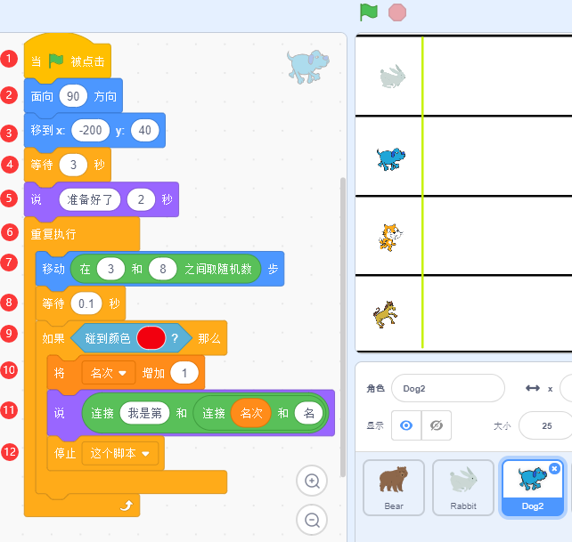 - 狗狗1:开始→朝向→初始位置→等待→准备好了→跑步【移动步数→时间间隔→是否碰到终点线(名次+1→说出名次→停止当前脚本)】