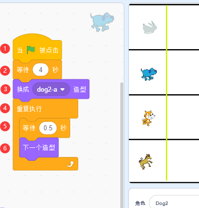 - 狗狗2:开始→等待→初始造型→切换造型【时间间隔→下一个造型】