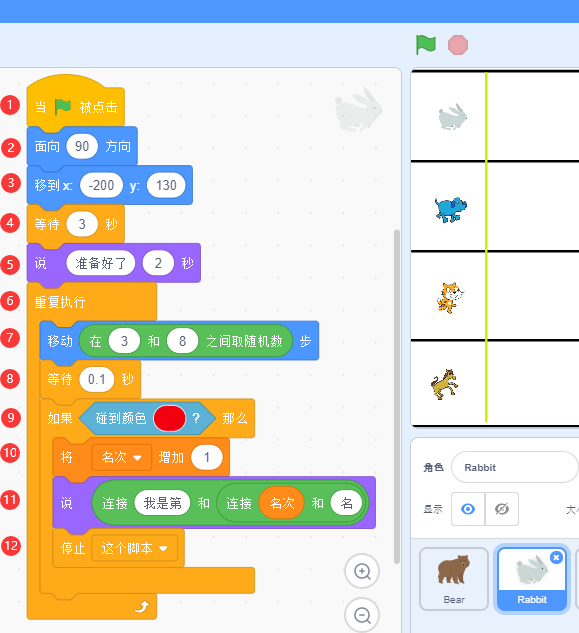 - 兔子1:开始→朝向→初始位置→等待→准备好了→跑步【移动步数→时间间隔→是否碰到终点线(名次+1→说出名次→停止当前脚本)】