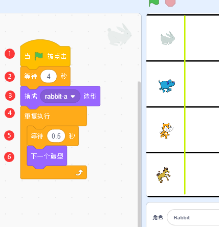 - 兔子2:开始→等待→初始造型→切换造型【时间间隔→下一个造型】