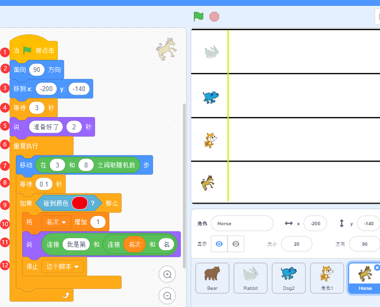 - 小马1:开始→朝向→初始位置→等待→准备好了→跑步【移动步数→时间间隔→是否碰到终点线(名次+1→说出名次→停止当前脚本)】