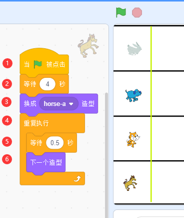 - 小马2:开始→等待→初始造型→切换造型【时间间隔→下一个造型】