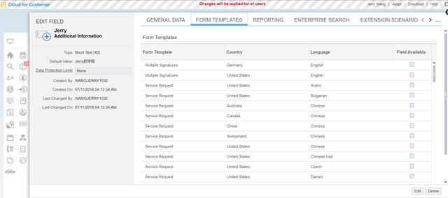 同SAP CRM相比,C4C的扩展字段除了UI之外,还能放到其他模型上,比如放到Adobe Form template上: