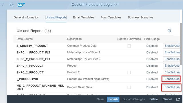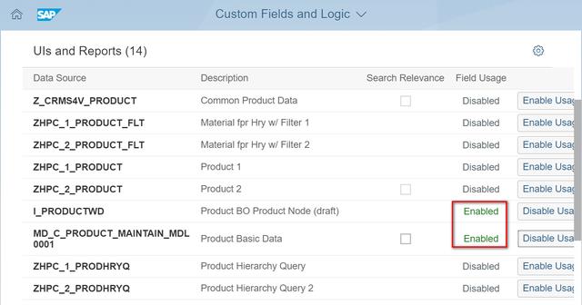 然后点击标签页“UIs and Reports", 点击I_PRODUCTWD和MD_C_PRODUCT_MAINTAIN_MDLD对应的Enable Usage按钮:
