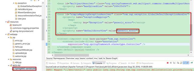 Bean的ID设置为simpleMappingExceptionResolver,class设置为步骤一创建的类的包含namespace的全名。创建一个名为defaultErrorView的property,其value为generic_error, 指向一个JSP view:generic_error.jsp。