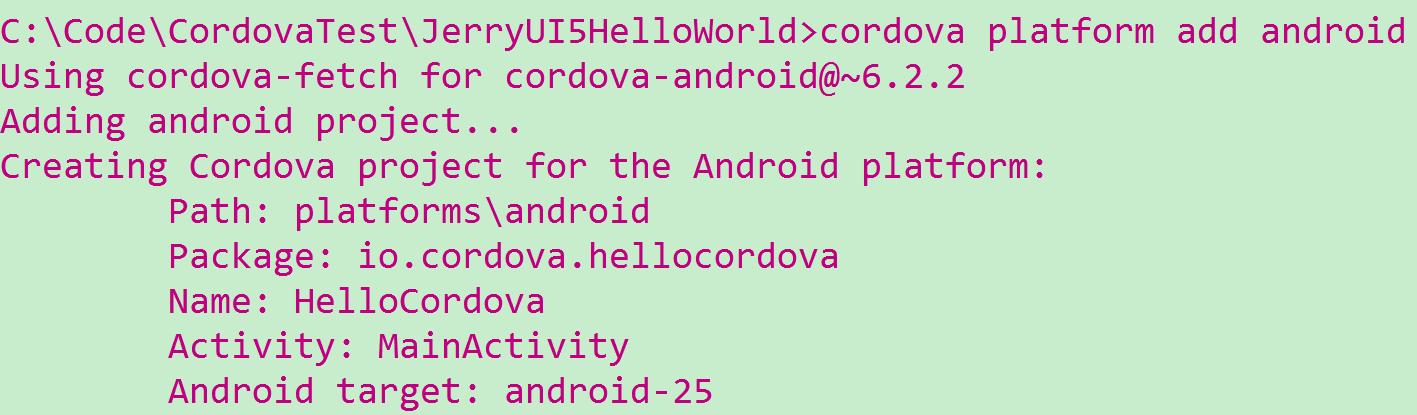 4. 假设我们想打包成一个可以安装到Android平台的应用,那么得为该Cordova项目添加对Android平台的支持。使用命令行添加:cordova platform add android