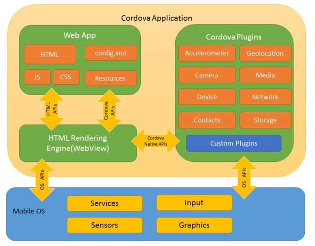 以Android框架为例,Cordova能将您的前端应用里的JavaScript和HTML资源打包成Android原生的apk文件,可以直接在安卓手机上安装。运行时,这些JavaScript和HTML直接运行在Cordova提供的一个嵌入式的WebView控件里,对于手机用户来说,他们对此毫不知情,以为自己使用的是手机原生应用。