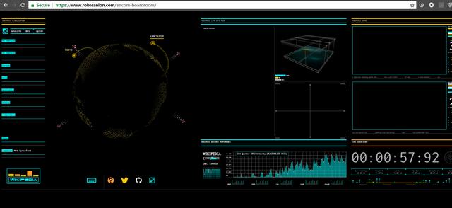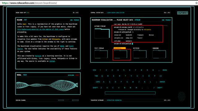 进入之后,会看到一个炫目的控制台。左下角的动画效果很像电影《生化危机》里的DNA双螺旋模型。屏幕右边是一个控制台,你在键盘上输入的字符会有个酷炫的动画效果:
