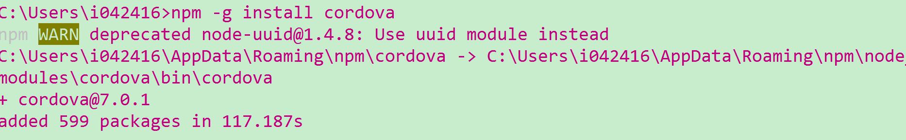 2. 使用nodejs的包管理器npm安装Cordova。命令行:npm -g install cordova: