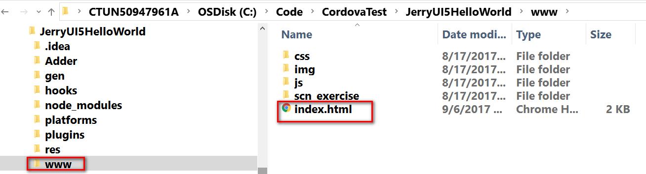 5. www文件夹下有个自动生成的index.html文件。我们用命令行cordova prepare, 这个index.html会自动被拷贝到文件夹platformsandroidassetswww下面。这揭示了Cordova使用的一个最佳实践:我们所有的前端开发,都是直接在Cordova项目文件根目录的www文件夹内进行。开发结束后,使用cordova prepare,根目录的www文件夹里的资源会自动被拷贝到该项目支持的移动平台对应的文件夹内,在我的例子里是platformsandroidassetswww。