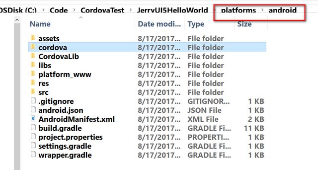 命令行执行完毕后,我们敬如platforms文件夹,发现多了一个android文件夹,里面多出很多文件夹和资源。这些自动生成的东西都是最后打包生成安卓应用APK文件所必须的。