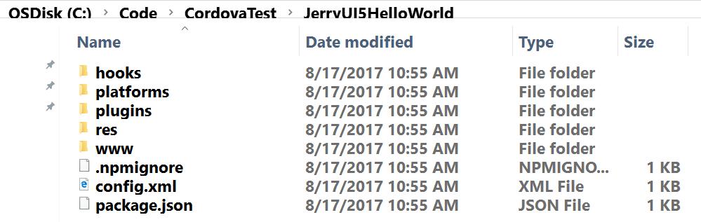 于是一个新的Cordova项目被自动创建出来了。里面包含很多子文件夹。