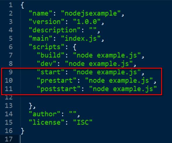 重点看第9行~第11行,意思就是当npm执行命令时,如果执行到名为start的生命周期事件(lifecycle event),则执行nodejs的命令node example.js,如果执行到名为prestart的生命周期事件, 则执行nodejs命令node example.js,对于poststart也同理。