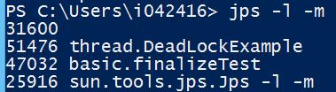 使用命令行 jps -l -m找到处于死锁状态应用的进程id。从下图得知死锁进程为51476:
