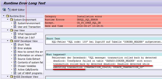 ABAP和Java不同,一旦检测到死锁,应用会抛运行时异常并自动终止,异常信息里说得很清楚:Deadlock detected while executing transaction…