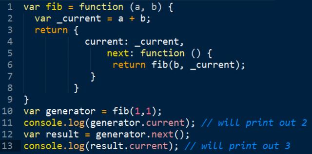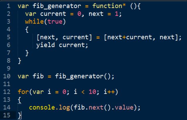 代码第40行到第47行,我们使用了ES6 function*关键字得到了一个"function generator"。在这个generator内部,我们定义了一个无限循环,用于计算非波拉契数列。
