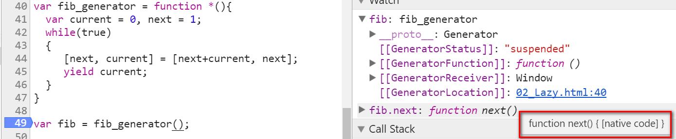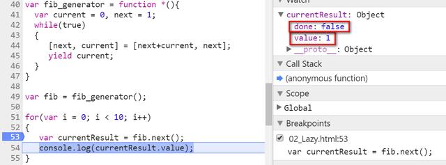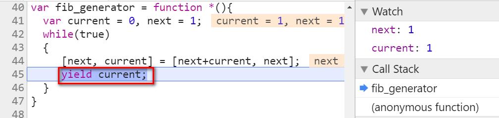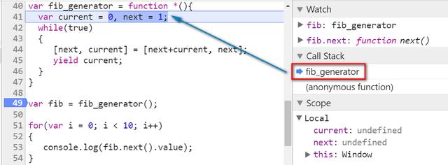 第49行,我们用()调用了这个generator,将结果存储在变量fib里。直到此时,function generator的实现体,即代码41~45行还没有得到执行。