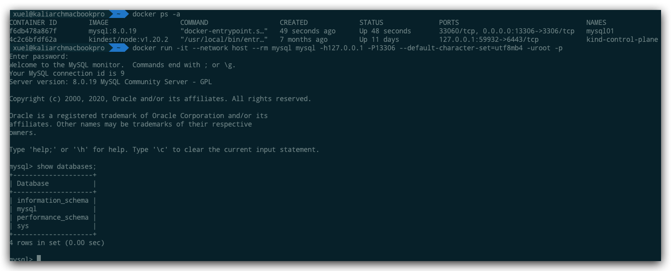 docker run -it --network host --rm mysql mysql -h127.0.0.1 -P13306 --default-character-set=utf8mb4 -uroot -p