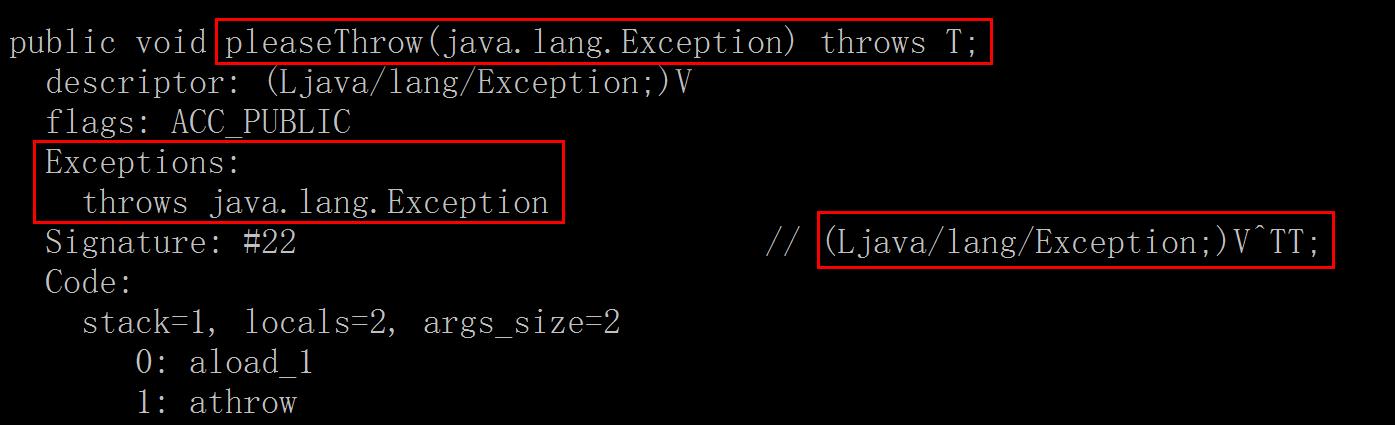 我们从上图能观察到,方法pleaseThrow和雷ExceptionForQuiz的泛型参数RuntimeException已经被擦除掉了。pleaseThrow这个方法能抛出的异常类型已经被擦除成为Exception了。