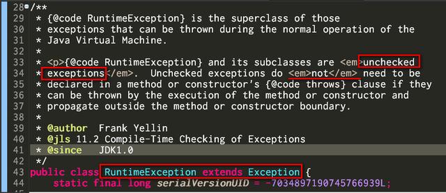 看JDK RuntimeException的注释说的很清楚:Unchecked exceptions do NOT need to be declared in a method or constructor’s clause if they can be thrown by the execution of the method or constructor.