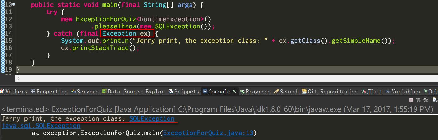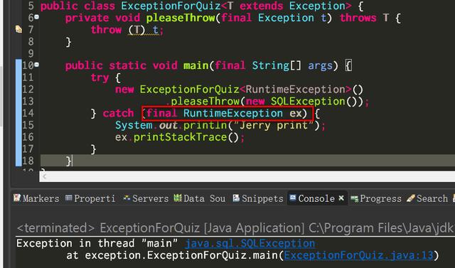 看下面这段程序。方法pleaseThrow接受一个Exception的实例,然后简单地将该实例抛出。然后调用这个方法时,我传入了一个SQLException的实例。因为pleaseThrow的调用包裹在一个try catch块里,