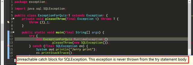 根据异常类型擦除的事实,这个错误消息是合理的,因为pleaseThrow方法的声明现在只能抛出类型为Exception的异常,所以第14行的catch永远也没有办法接收到类型为SQLException的异常,所以编译器抛出错误。