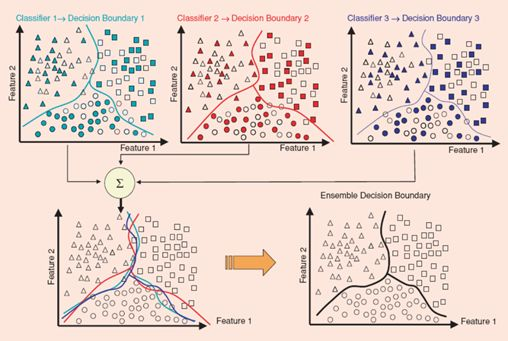 如下图,三种分类器的分类结果都有一点点错误,如果把三类组合在一起就可以完美地把所有形状都区...