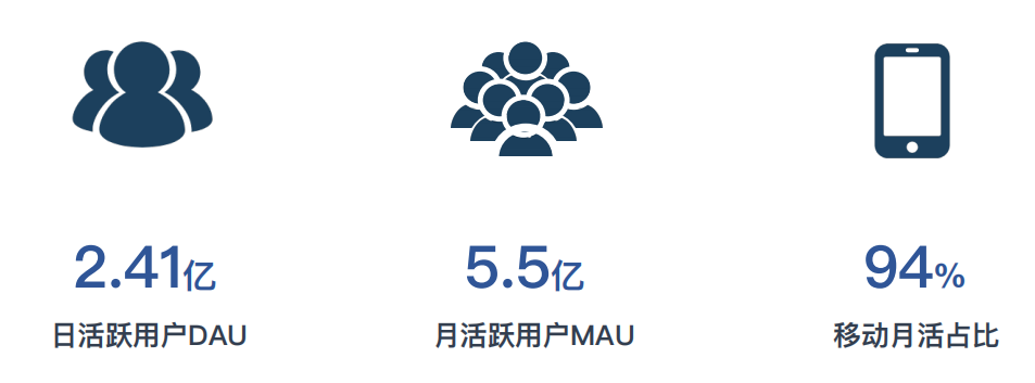 财报显示:微博拥有2.4亿日活DAU,5.5亿月活MAU,94%的移动月活占比。