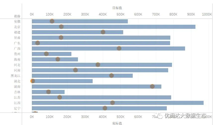 从图例可以看出,滑珠图是条形与散点的组合图表,用圆点在条形图上的不同位置表示实际数值的大小。