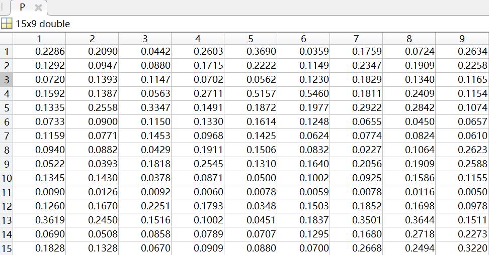 本次我们要训练9个15维的输入数据,输出数据为9个3维矩阵,测试输入数据为3个15维数据,测试输出数据为3个3维数据。训练数据和测试数据如下。训练输入数据为P,训练输出数据为T,测试输入数据P_test,测试输出数据为T_test(PS:注意列数代表数据个数,行数代表维数)。