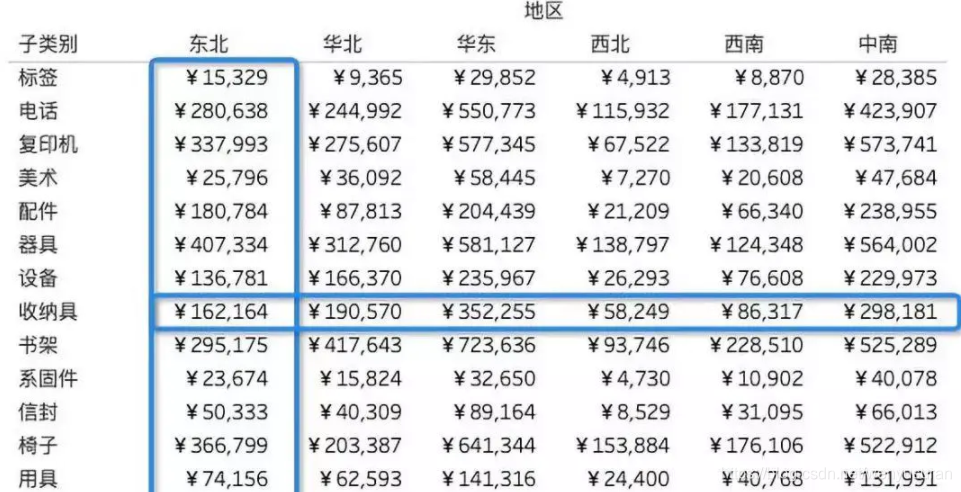 将维度“地区”拖放至列,将维度“子类别”拖放至行,再将度量“销售额”拖放至“标记”卡的文本中,工作表视图中出现如下文本表。