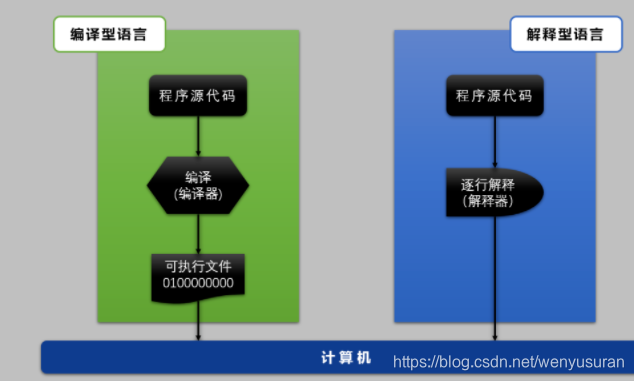 计算机只能识别机器语言(0和1),如11000000 。但是,我们的程序猿们不能直接去写01这样的代码,所以,要想将程序猿所开发的代码在计算机上运行,就必须找工具来翻译成机器语言,这个工具就是我们常常所说的编译器或者解释器。