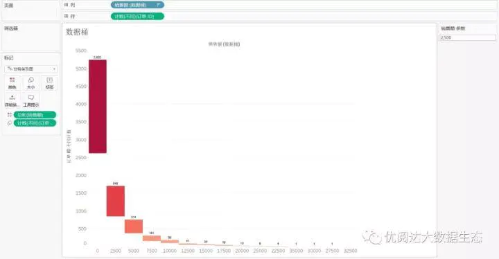 例如下图,我们通过直方图呈现出销售额在0~2500,2500~5000……区间的订单数量,代表销售额的横轴的轴距便固定在2500。