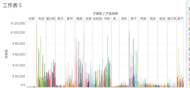 大量类别存在的情况,相对于条形图,下面这种散点图的呈现会更直观:能清晰的看到每个大类别下,精确到每种产品名称的销售情况(每个点代表一个产品,不同颜色代表不同子类别)。