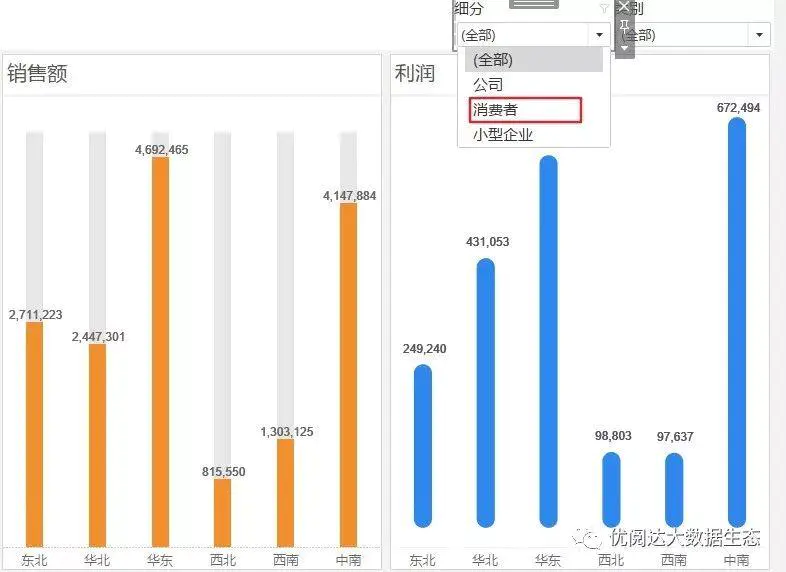 首先,我们创建2个工作表,然后放入仪表板中。可以看到,默认状态下,细分筛选器中的 消费者 是排在第二位的。