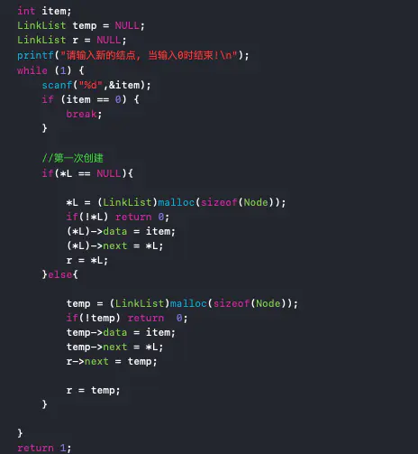 YES->创建一个新结点,并使得新结点的next 指向自身; (*L)->next = (*L);