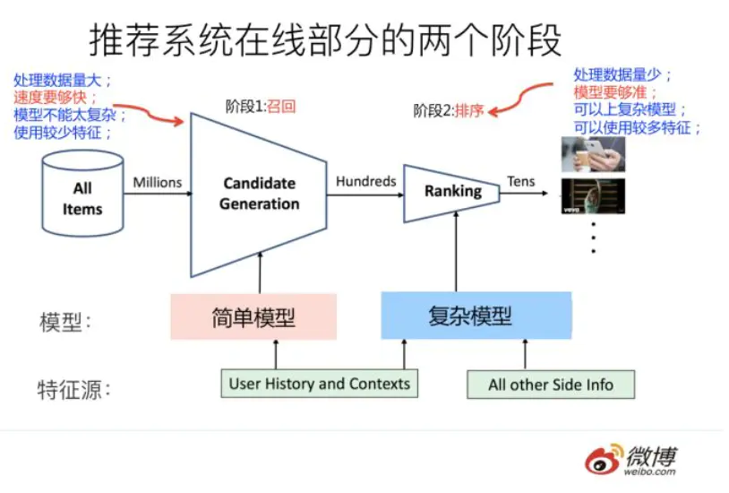 排序阶段:即对上一阶段粗筛出来的待推荐产品进行精挑细选,此阶段为了推荐出符合用户心意的产品,需要模型尽量的准确。而且由于粗筛阶段将数据量减少到几千,甚至几百级别,所以使用复杂模型,并且特征维度也可以尽量丰富,尽量多一些,这样训练出来的模型才能有较强的性能。