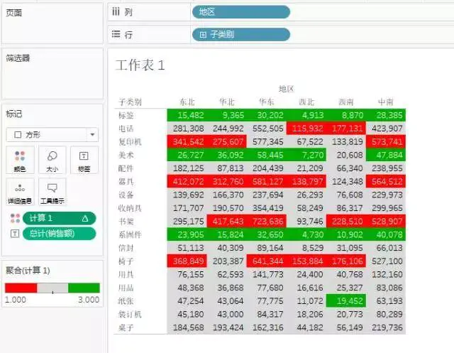 首先将子类别拖到行,地区拖到列,销售额拖至文本,创建如下工作表:
