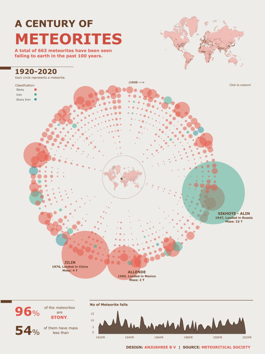 目前,全世界已收集到 4 万多块陨石样品,有各种样式的。仅在过去的 100 年里,就共有 663 颗陨石坠落地球,几乎每一年都有陨石坠落地球。本篇 Viz 的作者 Anjushree B V 根据 METEORITICAL SOCIETY 的数据,利用气泡图、符号地图及填充折线图搭建了可视化作品,为大家揭秘了一个世纪以来,坠落地球的陨石的名字、物质构成、重量以及掉落的时间、地点等信息。想知道陨石多久撞击地球一次吗?快来一探究竟~