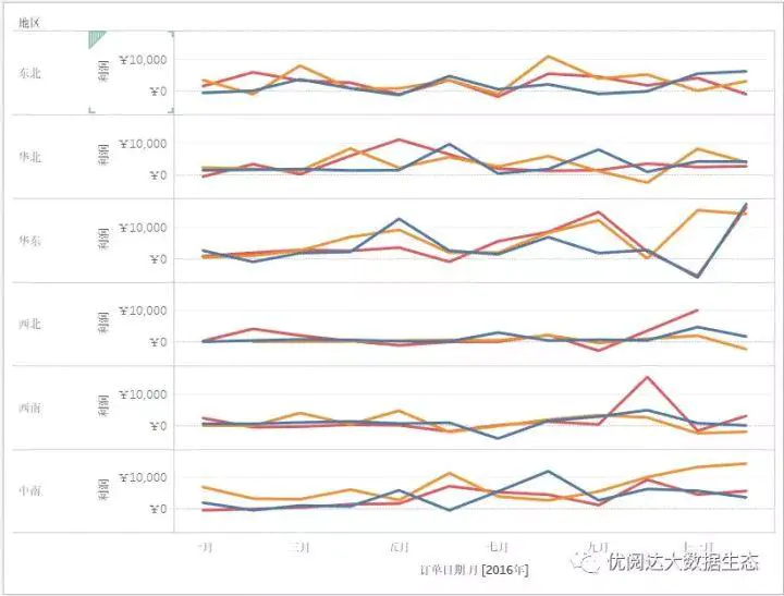 例如,对于下面这个各类别商品在 2016 年每个月份的利润变化情况表。图中有六个地区的数据,是否可以实现各地区经理打开视图的时候,只能看到自己地区的利润情况?