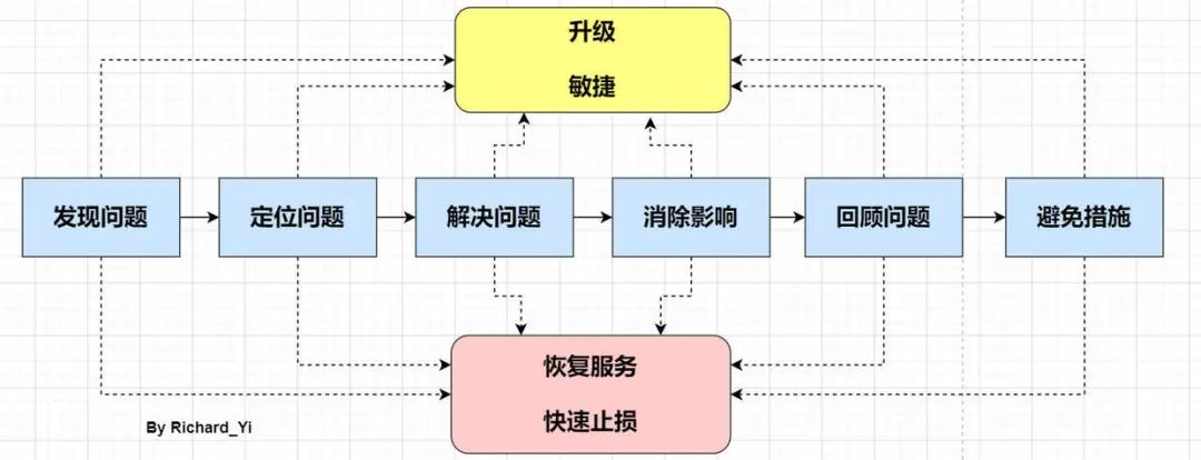 只不过这里先提示一下。在线上应急过程中要记住,只有一个总体目标:尽快恢复服务,消除影响。不管处于应急的哪个阶段,我们首先必须想到的是恢复问题,恢复问题不一定能够定位问题,也不一定有完美的解决方案,也许是通过经验判断,也许是预设开关等,但都可能让我们达到快速恢复的目的,然后保留部分现场,再去定位问题、解决问题和复盘。