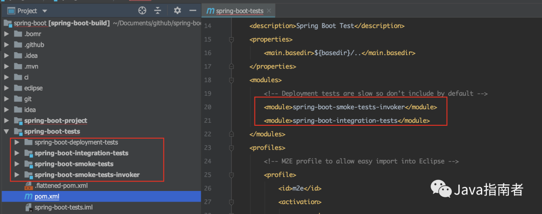 但是默认情况下的 spring-boot-tests module 里面只包含了下图两个,我们可以将 spring-boot-smoke-tests 写在下面的这个 modules 里面,这样 IDEA 就会将里面的代码进行当做一个 maven 项目了。