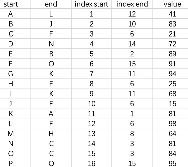 数据集就是随机生成的,[index start]和[index end]就是[start]和[end]中,各字母的放在一起的总排序值,排序决定了每个点在圆环中的位置,这个可以参考上面和弦图的文章。排序一定是按顺序的。