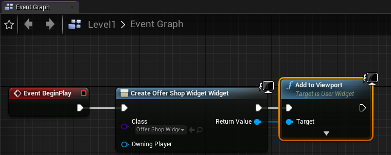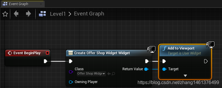 3.在事件图表中,游戏开始时,调用蓝图节点(CreateWidget)将UMG添加到游戏视图中: