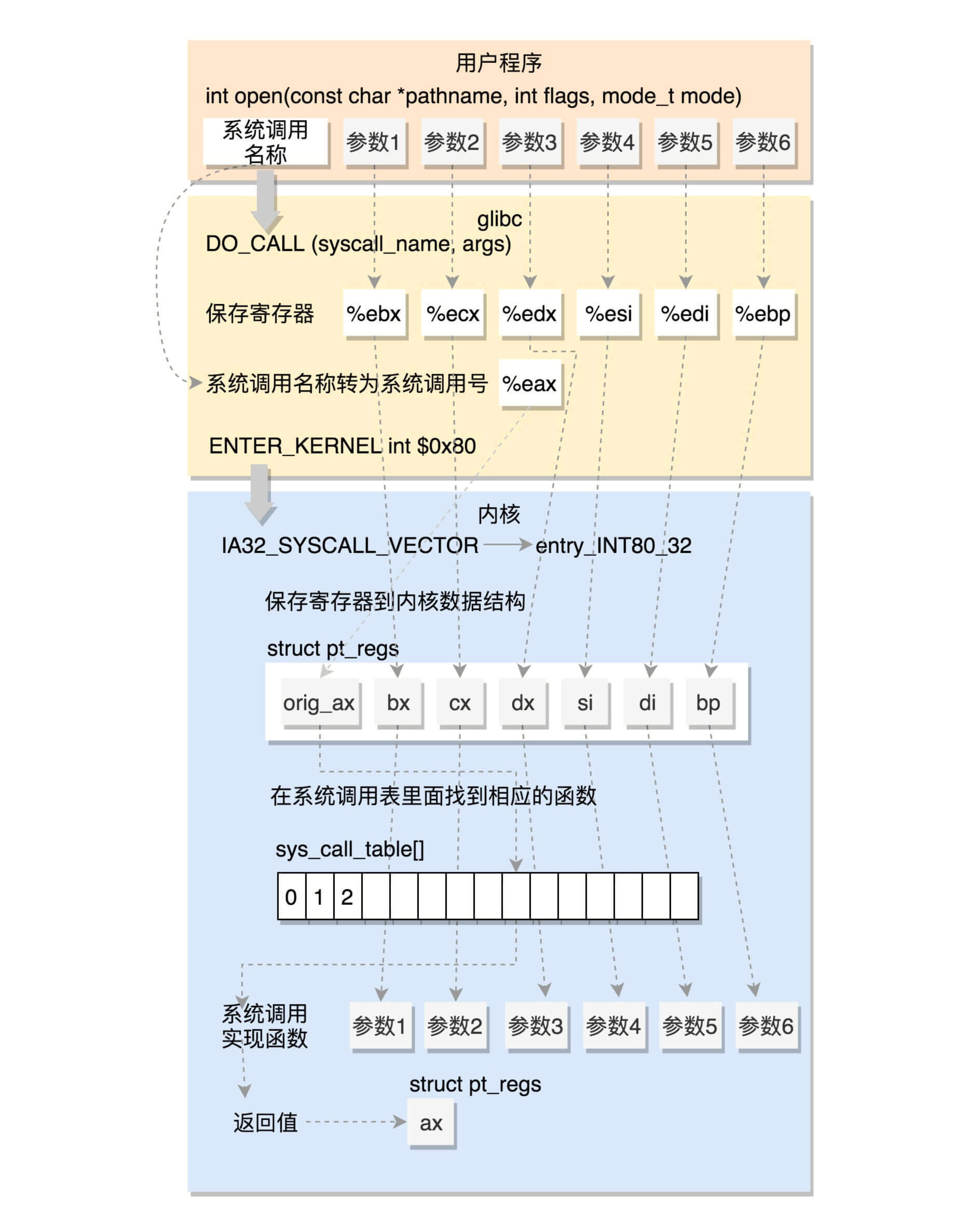 理解: 用户调用通过软中断进入内核态,在系统调用表中找到对应的内核系统调用,执行内核调用之前保存用户态寄存器,执行内核调用后返回并恢复用户态。
