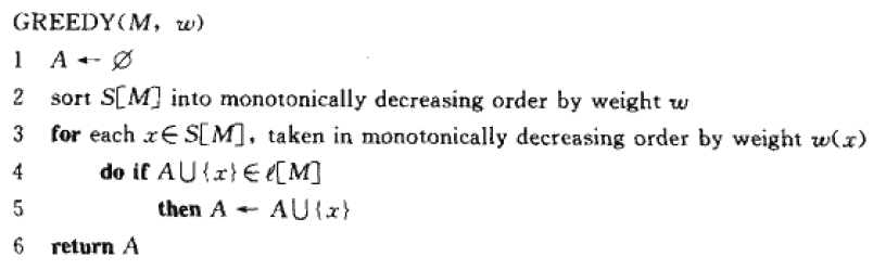 独立子集A初始化为空集,扫描的过程中,如果A加上当前元素还是独立子集,那就加上,如果不是那就不加,